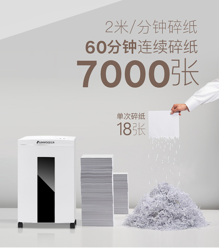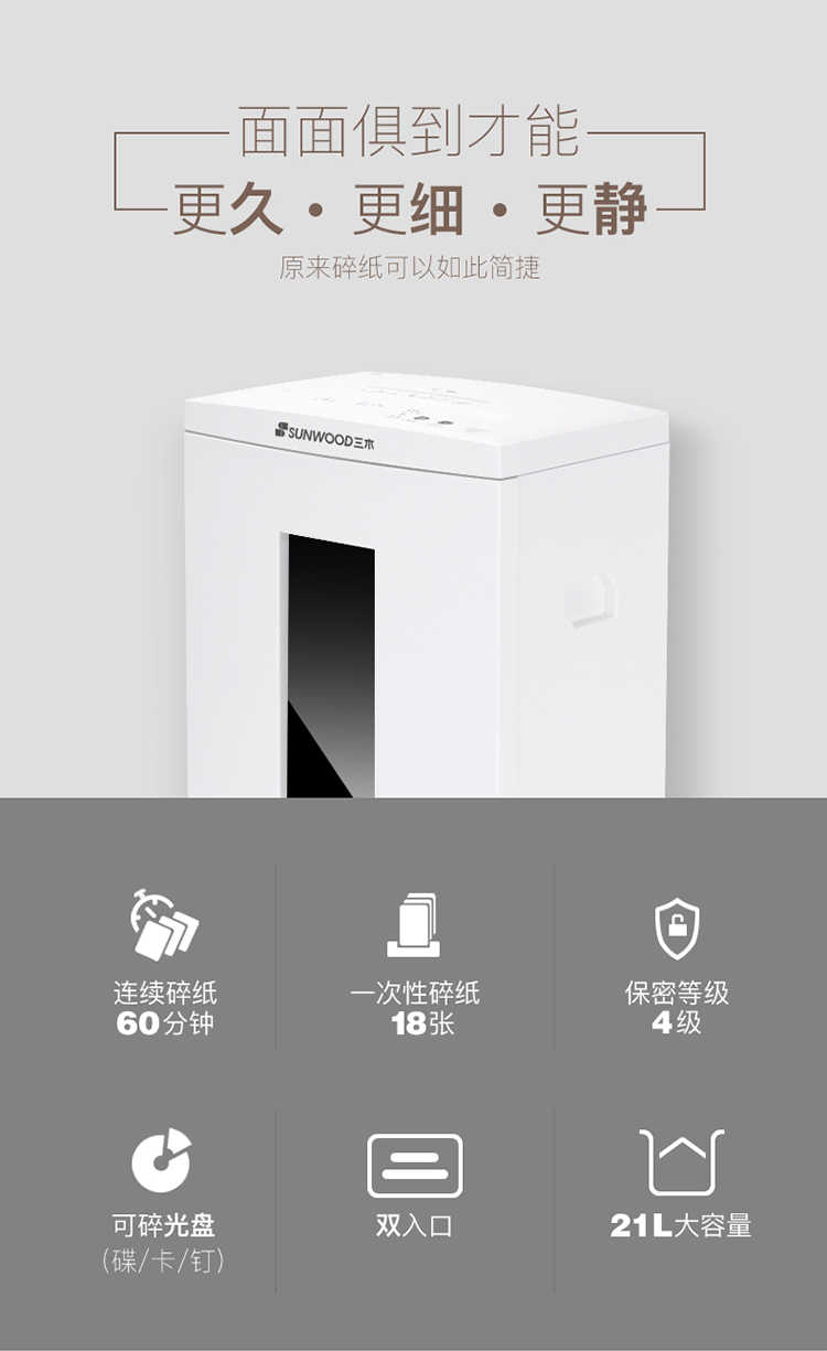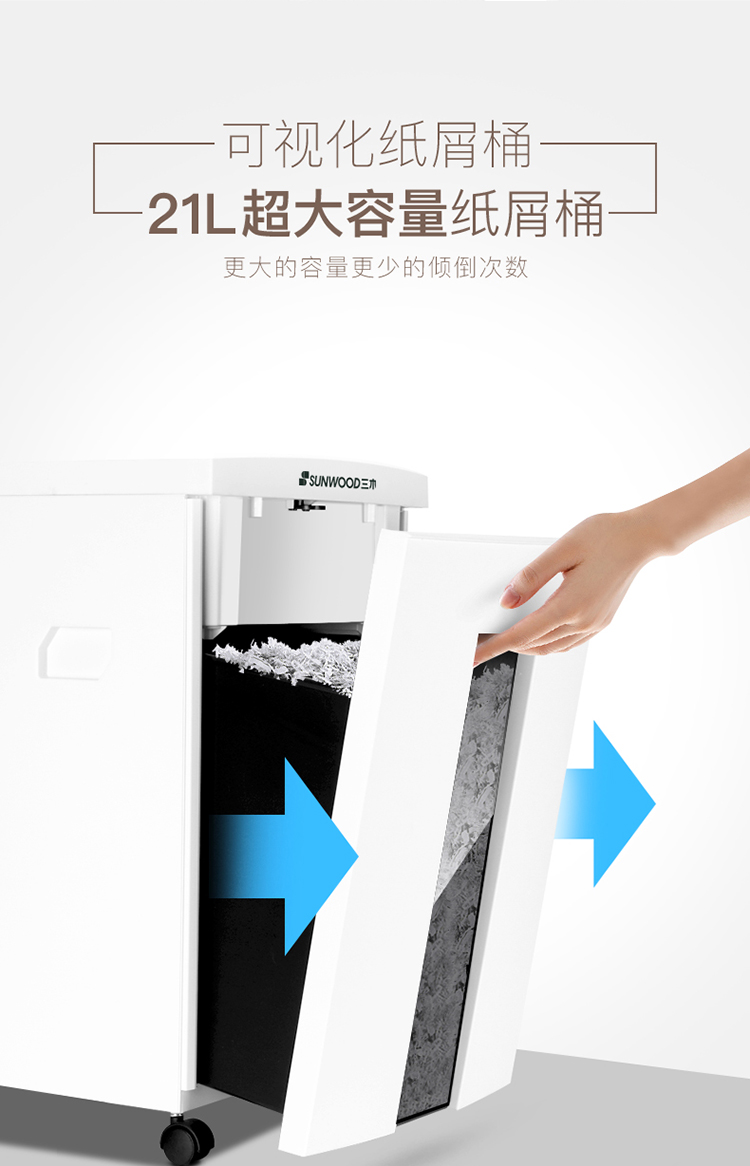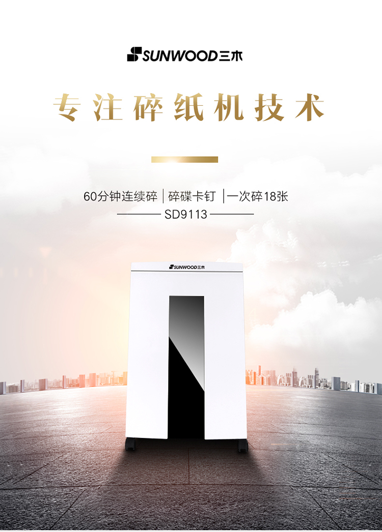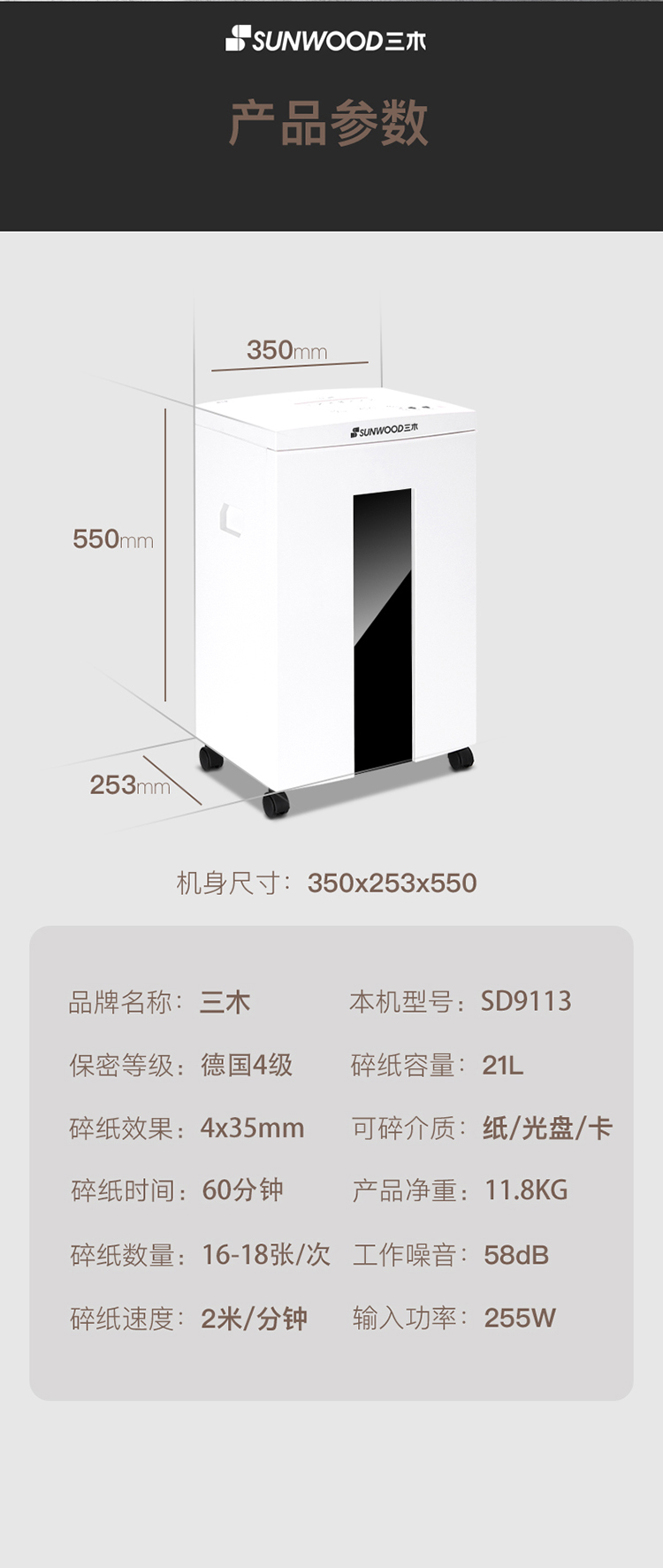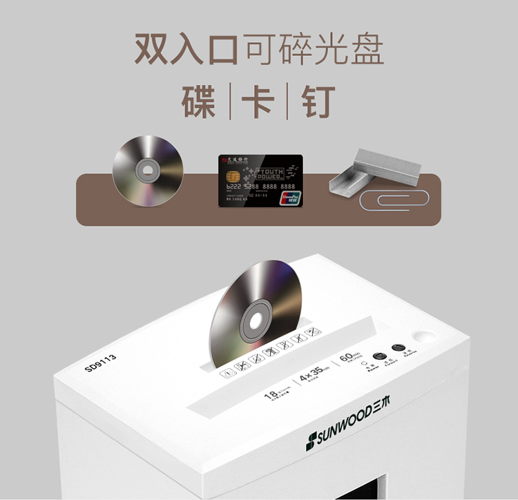 三木(SUNWOOD)4级保密 办公商用双入口碎纸机(单次16张 持续60分钟 21L 可碎卡,光盘,纸,针)SD9113 厂家直发