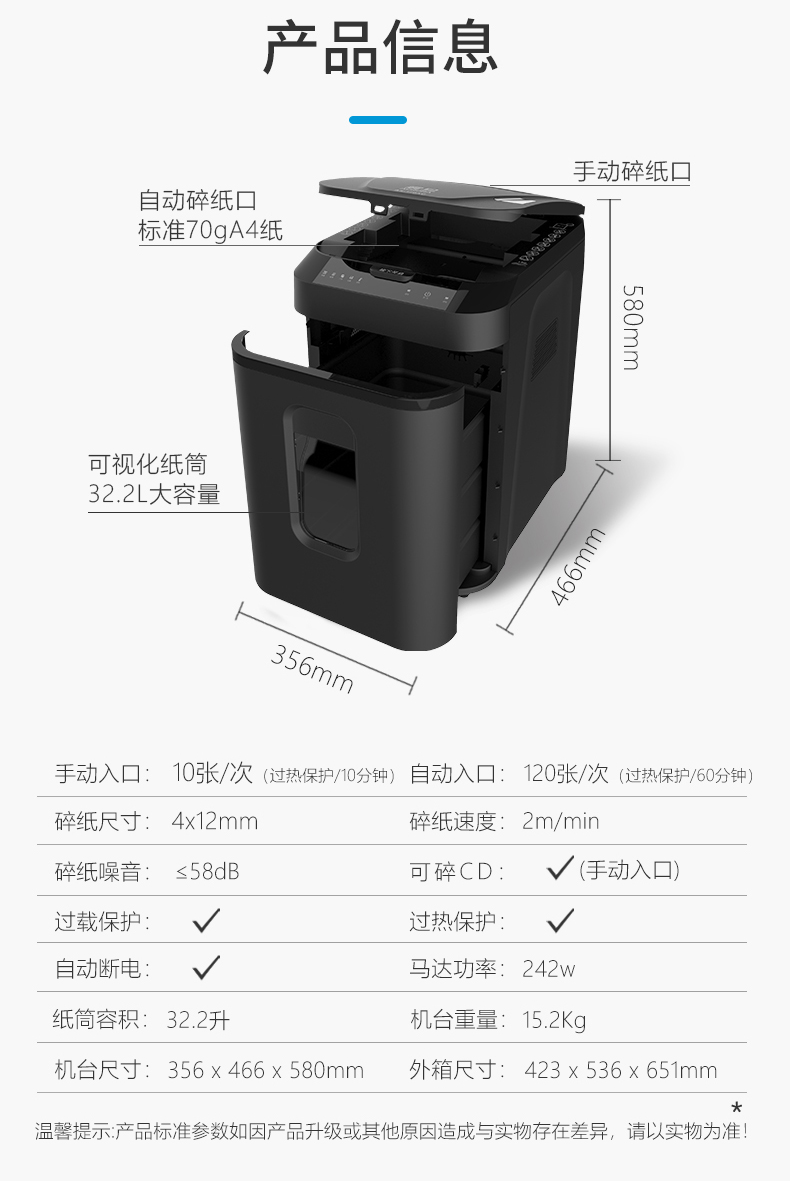 震旦AURORA 4级保密办公商用全自动碎纸机(自动120张 持续60分钟 32.2L 可碎卡、光盘) AS120CD
