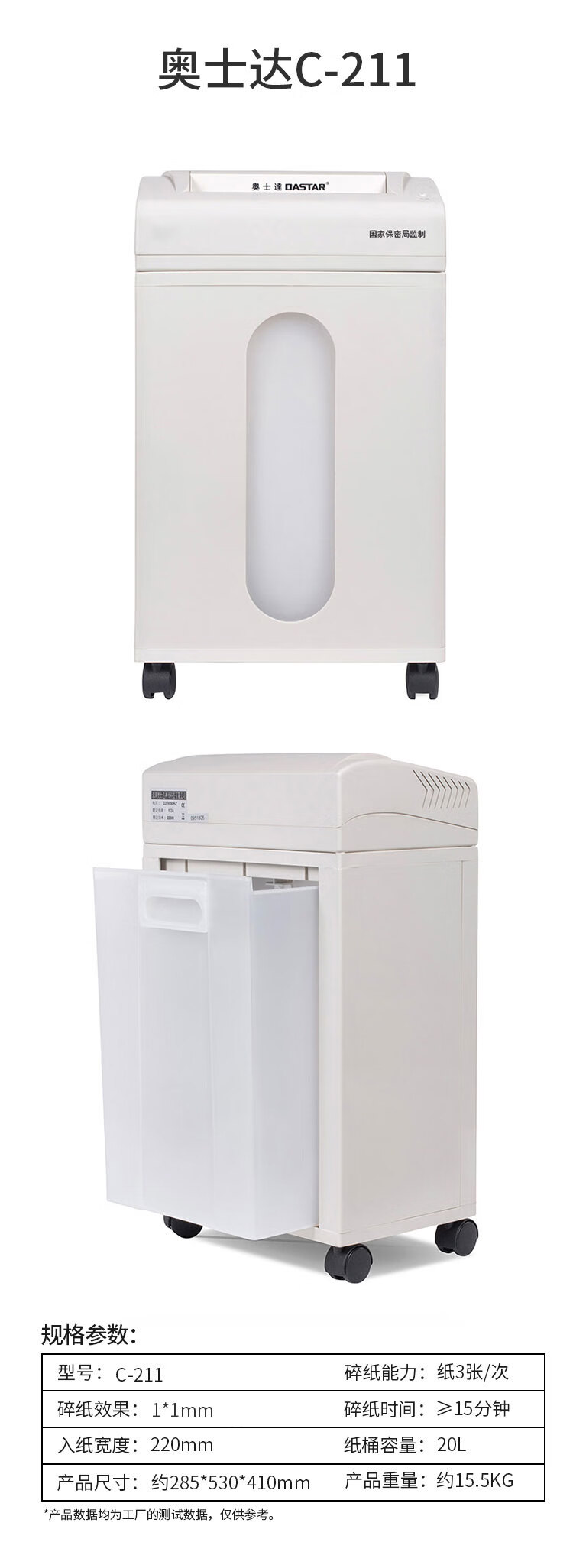 奥士达(OASTAR)C-211碎纸机 1*1mm纸介质高保密粉碎机