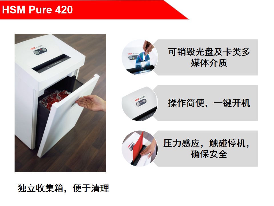 赫斯密(HSM)Pure420中型高保密商用办公碎纸机5级保密单次13张35L大容量粉碎机