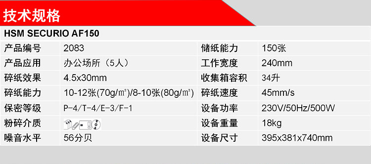 赫斯密(HSM) SECURIO AF 150 自动输稿碎纸机 可自动进纸150张 白色 4.5x3