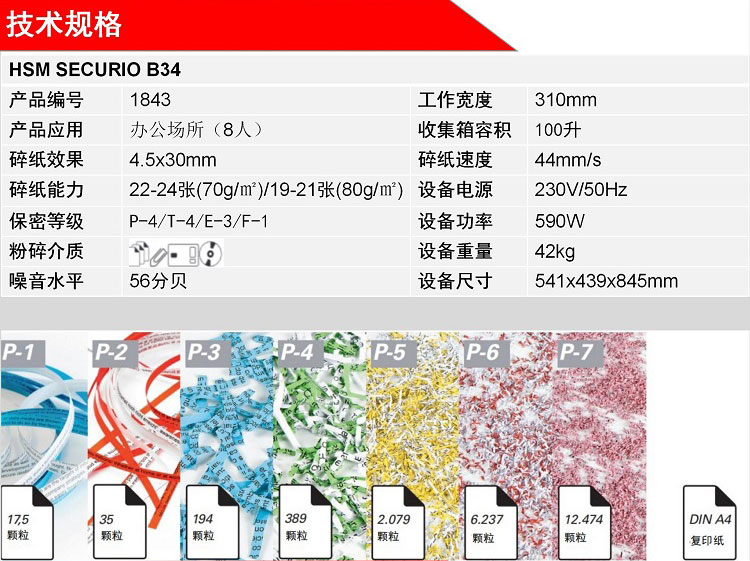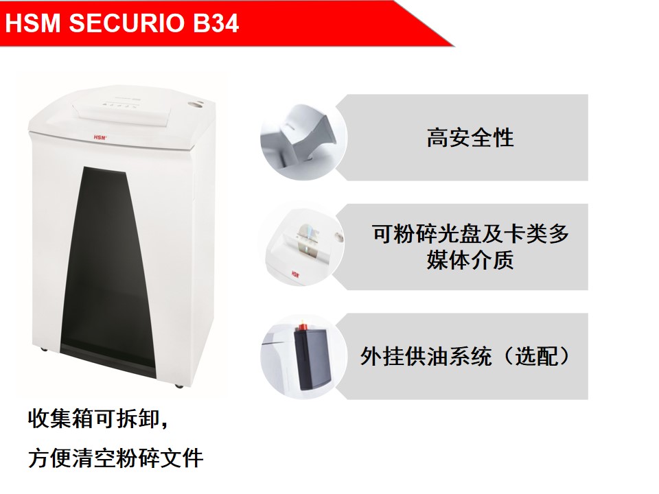 赫斯密(HSM) 4级保密SECURIO B34大型办公商用碎纸机可碎光盘单次23张100L大容量