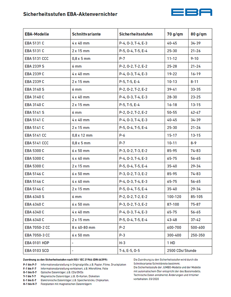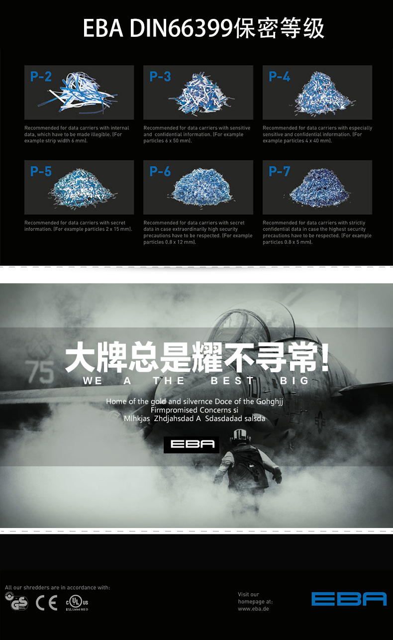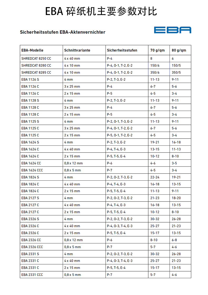 德国EBA公司于1922年成立,当时主要生产EBA切纸机。1935年,EBA公司生产出了世界上第一台条状碎纸机。1959年,生产出了世界上第一台段状碎纸机。至今,EBA公司已成为世界上最大的碎纸机生产商。EBA公司凭借近百余年所积累的研发设计经验,以及科学高效的生产管理模式,使其产品出口份额达到70%。在德国市场中,EBA约占40%的份额。EBA公司的碎纸刀具研发与生产具有世界领先水平,独特的组合式刀具是其他品牌所不具备的。EBA公司秉承一贯的优良传统,始终坚持尽善尽美的工作作风,打造每一款精良产品,向全世界提供最高品质的安全保密销毁设备。EBA公司通过了ISO9001标准、欧盟CE安全标准、德国GS安全标准认识。