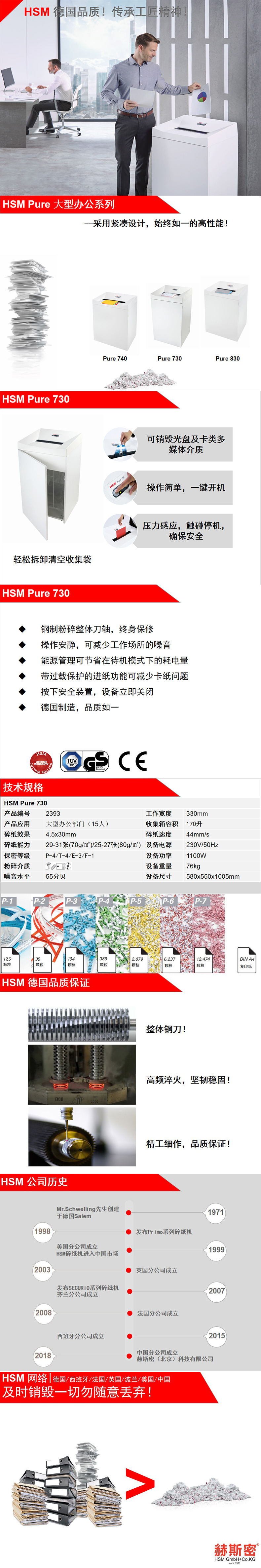 赫斯密(HSM)Pure730大型商用办公碎纸机4级保密可碎A3幅面单次31张170L持续60分钟
