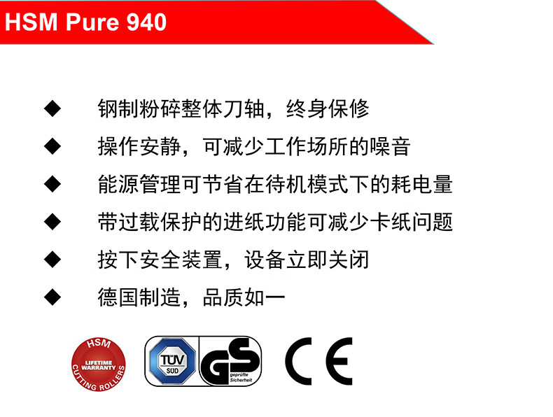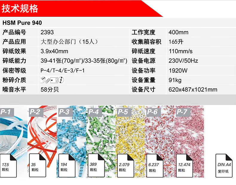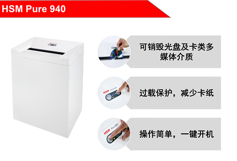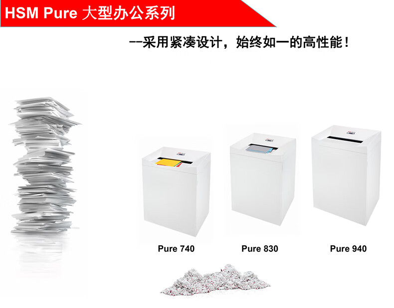 HSM Pure 940部门级大型办公碎纸机 德国4级保密 3.9*40mm, 单次粉碎39-41张 处理量大 可碎A3幅面