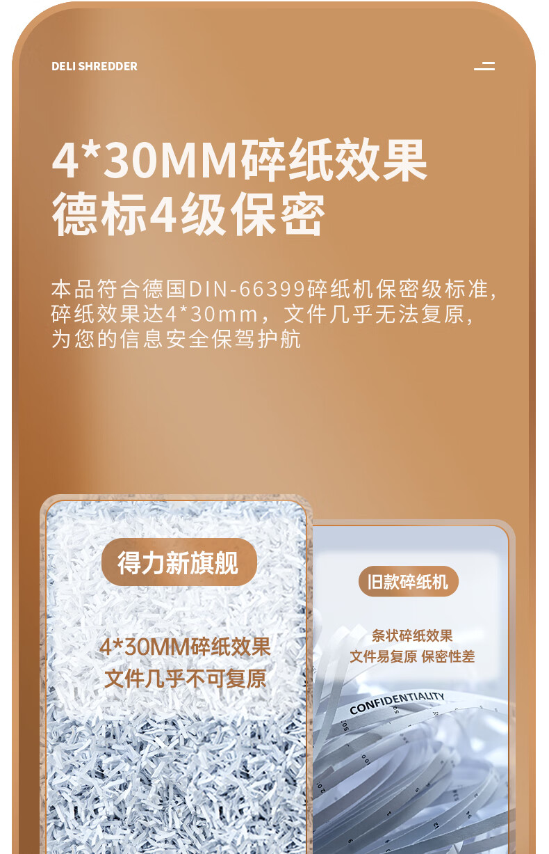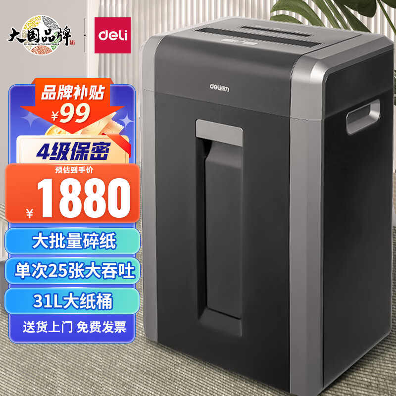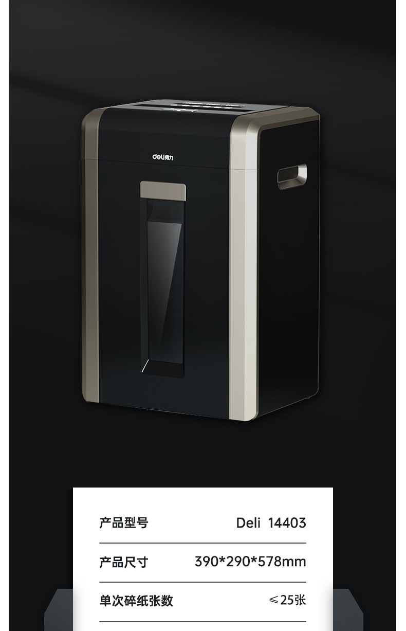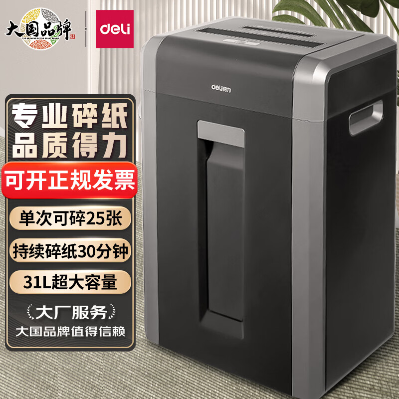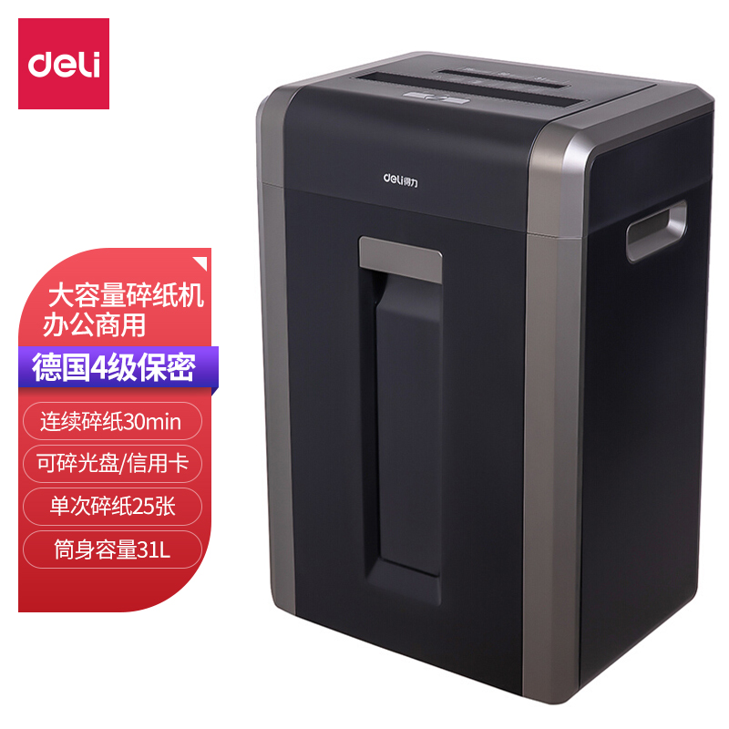 得力(deli)4级保密办公碎纸机 专业销毁碎纸机(单次25张 31L 持续30分钟 可碎卡碎光盘)14403