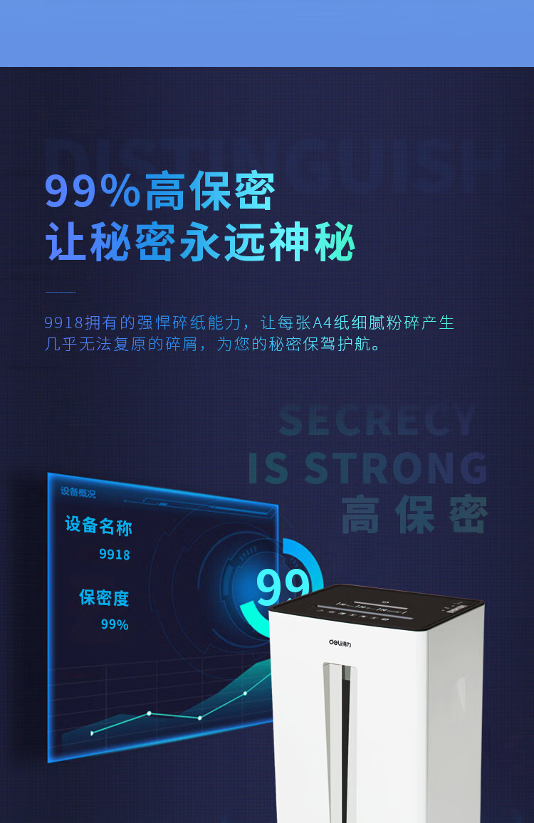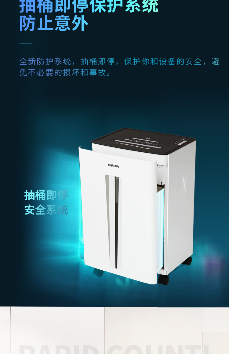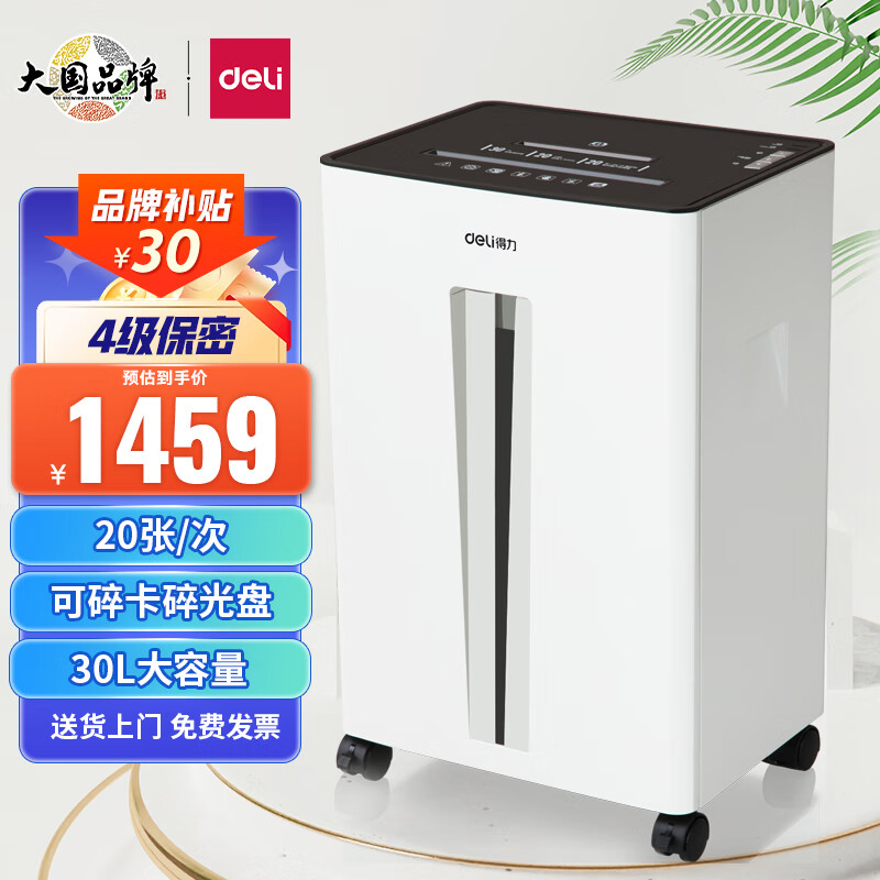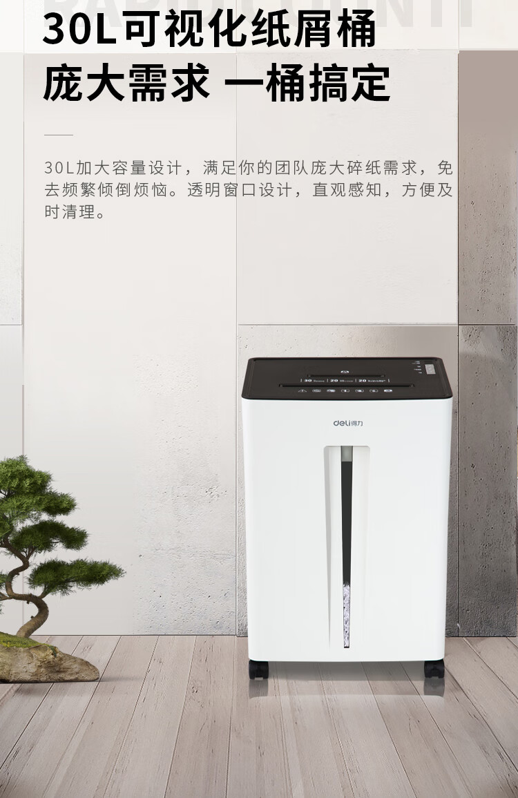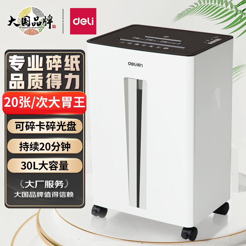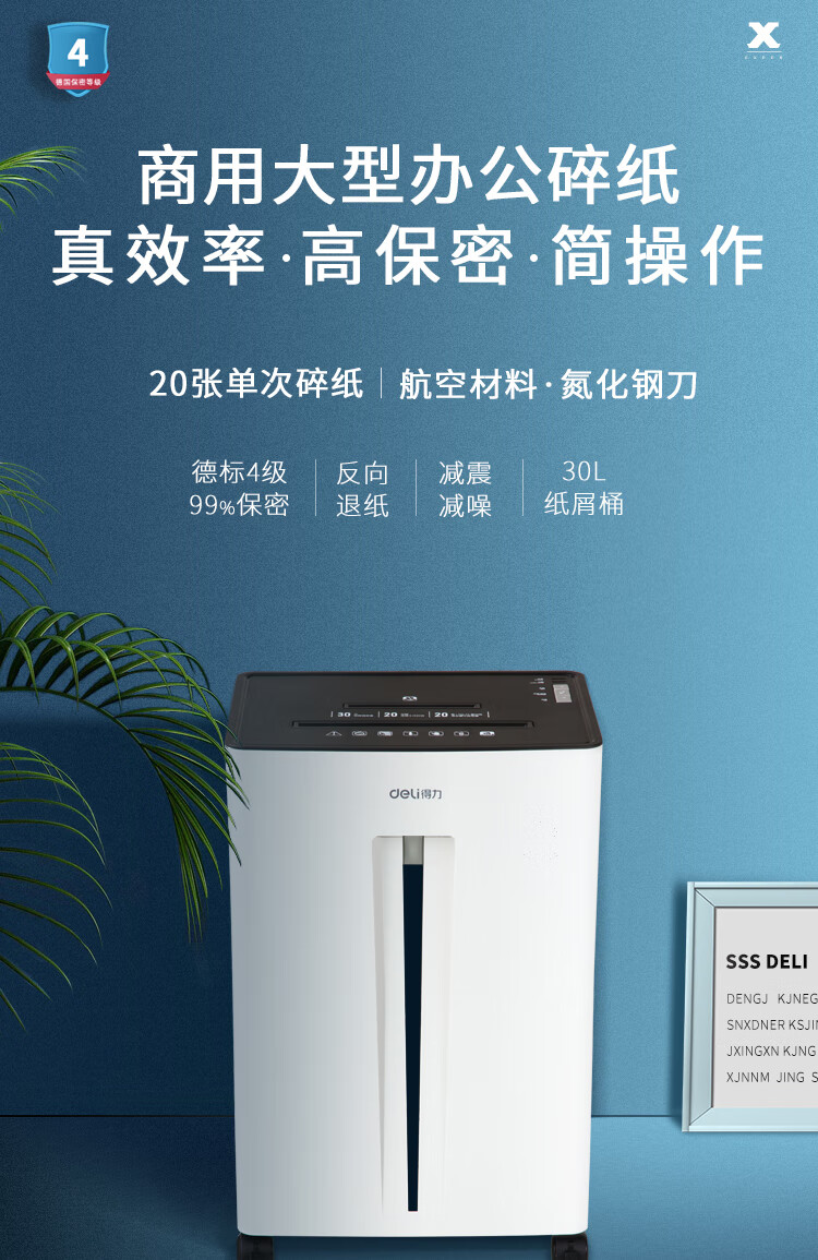 得力(deli)4级保密专业办公碎纸机(单次20张 30L 持续20分钟 可碎卡碎光盘)9918