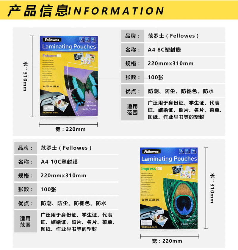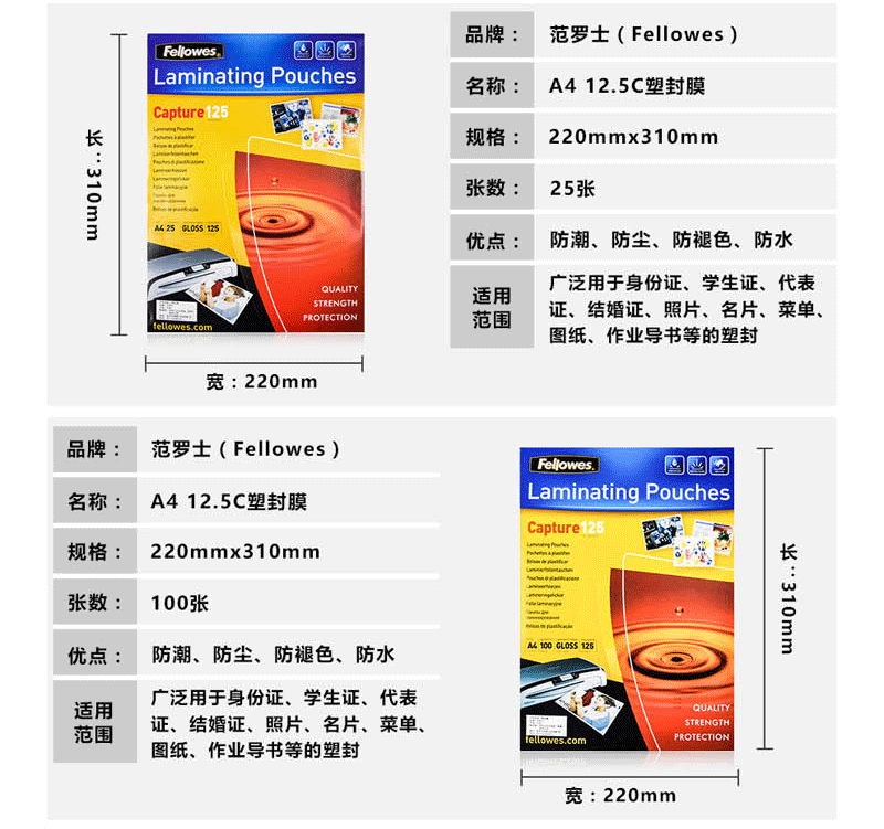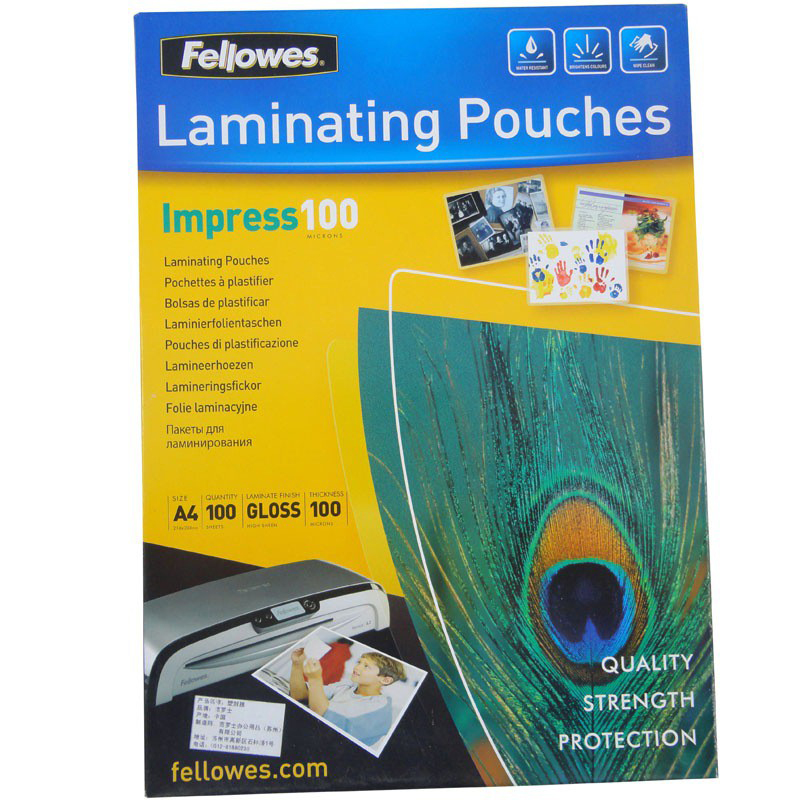 范罗士(Fellowes)A4 100mic塑封膜53511照片文件透明护卡膜过塑膜A4 10丝 100张
