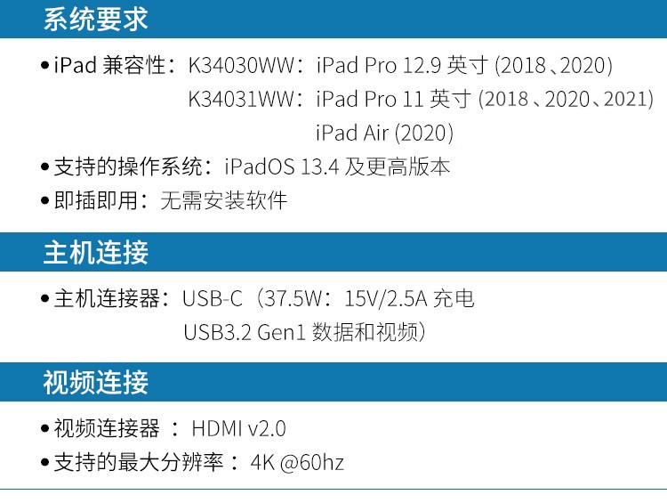 肯辛通(Kensington)iPad Pro苹果扩展坞站USB转换器千兆网口 适用11英寸 K34031(兼容2022版11寸)
