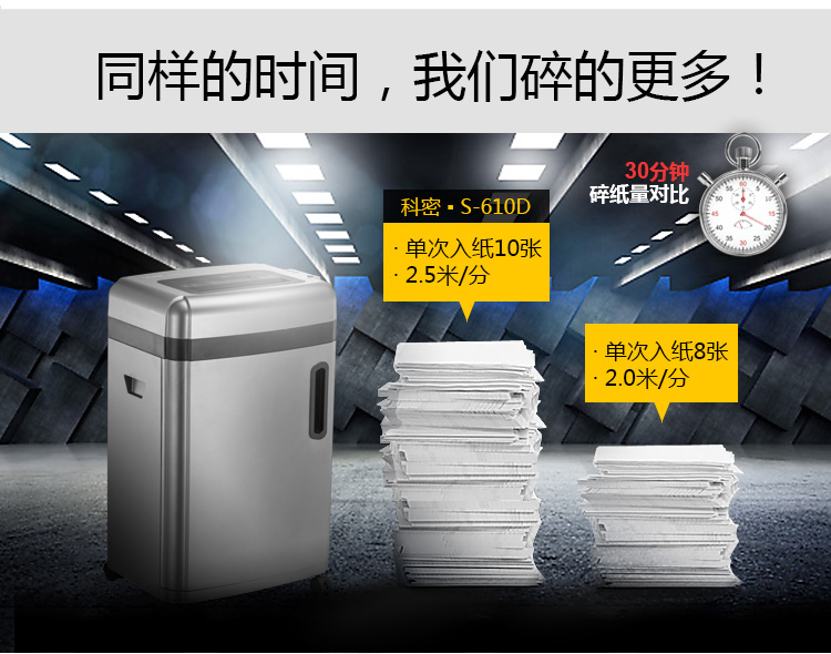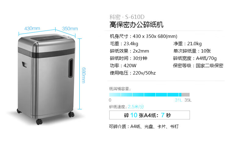 科密 S-610D 国家二级保密认证专业销毁碎纸机 中大型高保密办公商用粉碎机(10张 30分钟 31L 碎卡光盘)