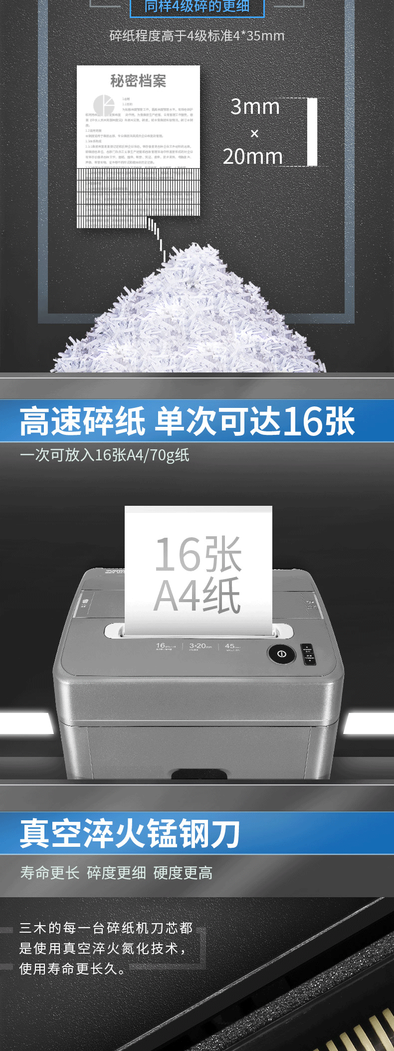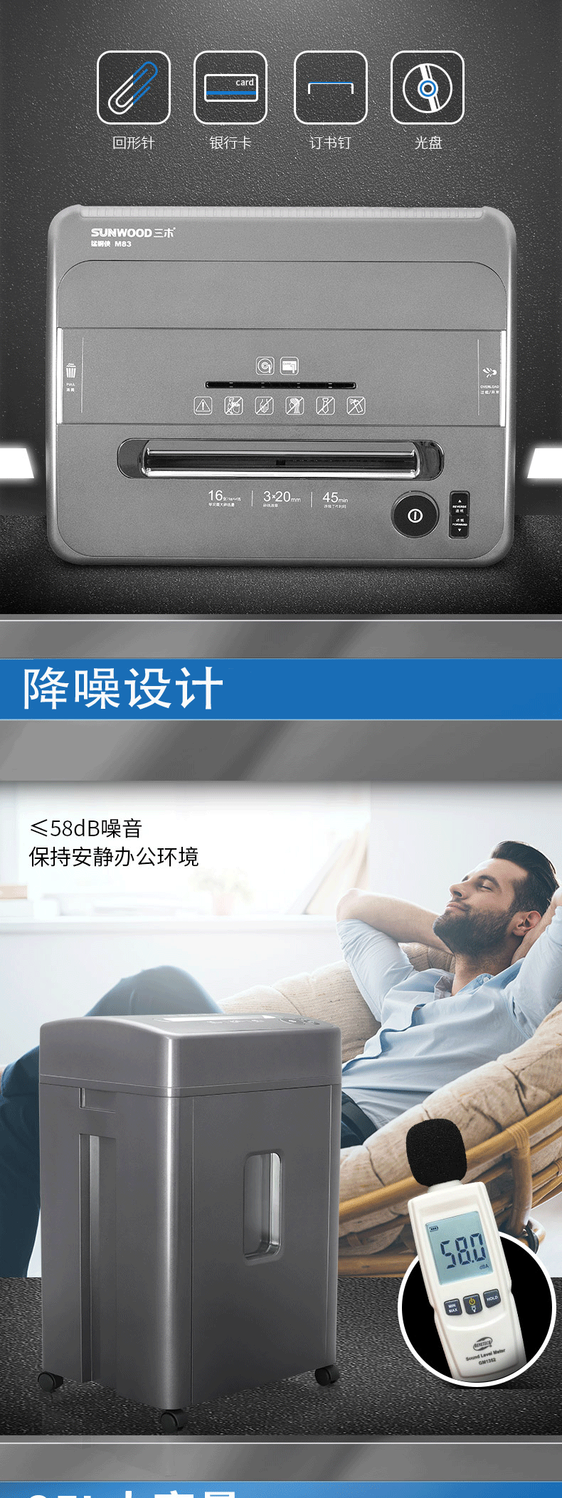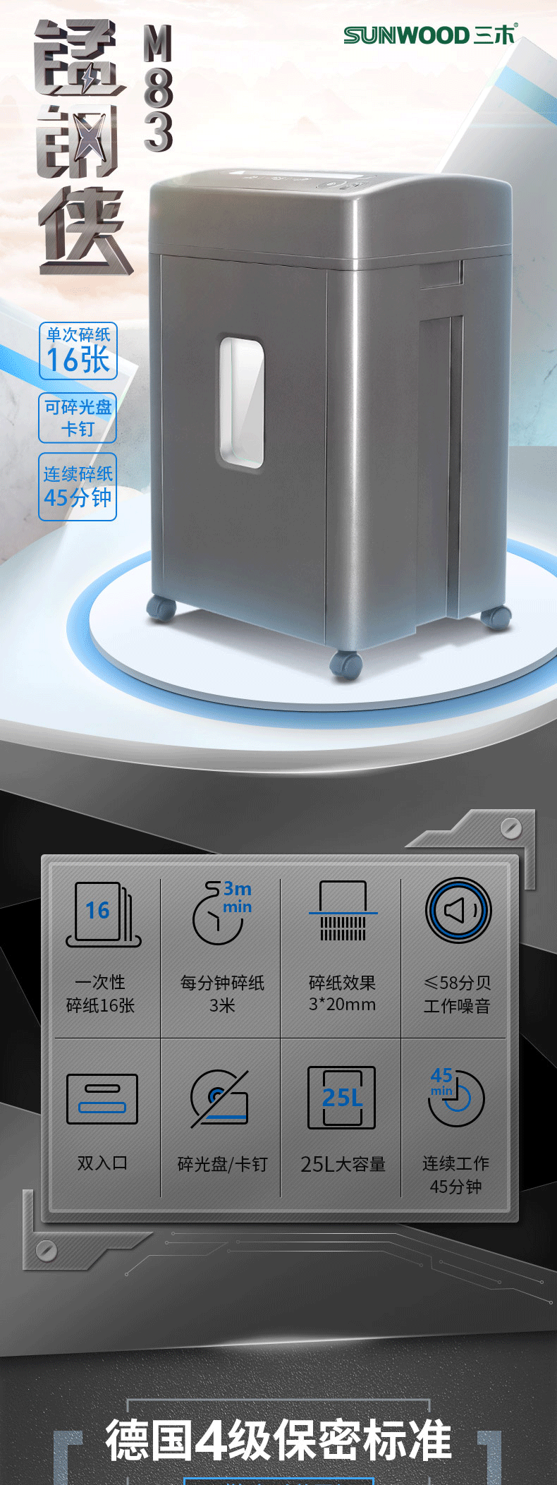 三木(SUNWOOD)M系列碎纸机 4级保密 双入口(单次16张 持续45分钟 25L 可碎卡,光盘,纸,针)M83 厂家直发