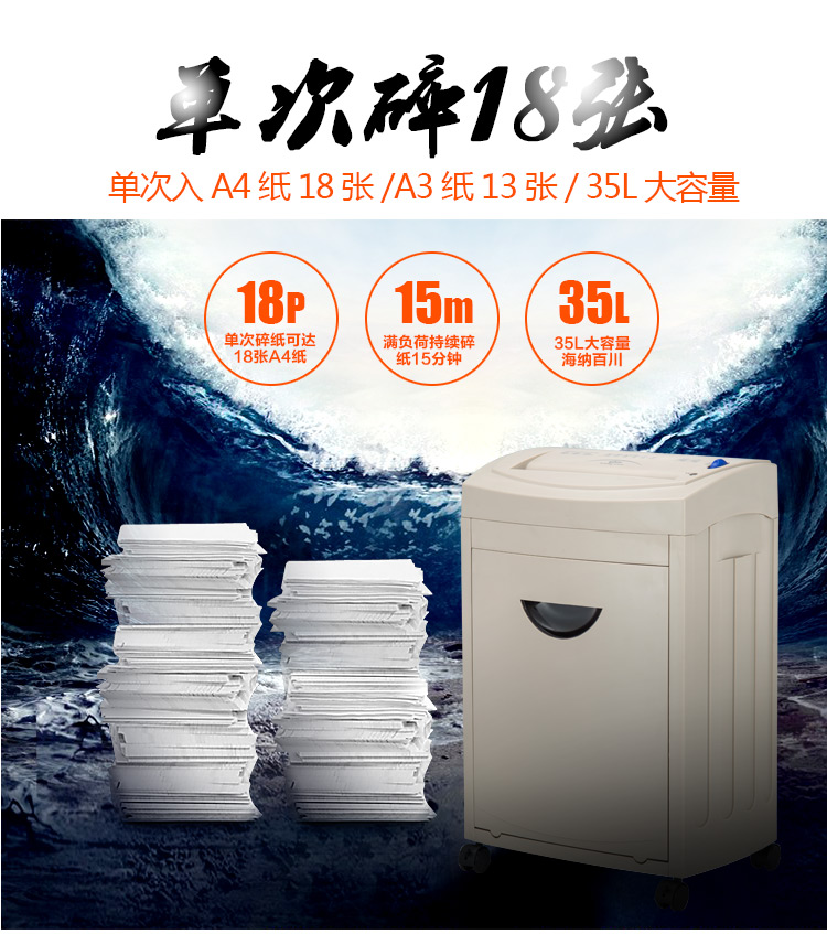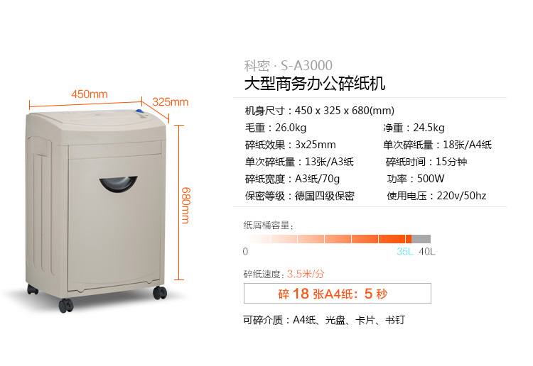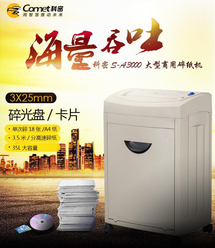 科密(comet)A3000 碎纸机大型A3/A4碎纸机大容量35L办公商用粉碎机碎卡光盘